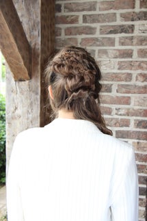 Voor haar dus een volledig opsteekkapsel. Ik maakte gebruik van een 2D-effect die een volumineus kapsel bezorgt aan de achterkant. Gewaagd maar geslaagd vind ik toch. Wat denken jullie?